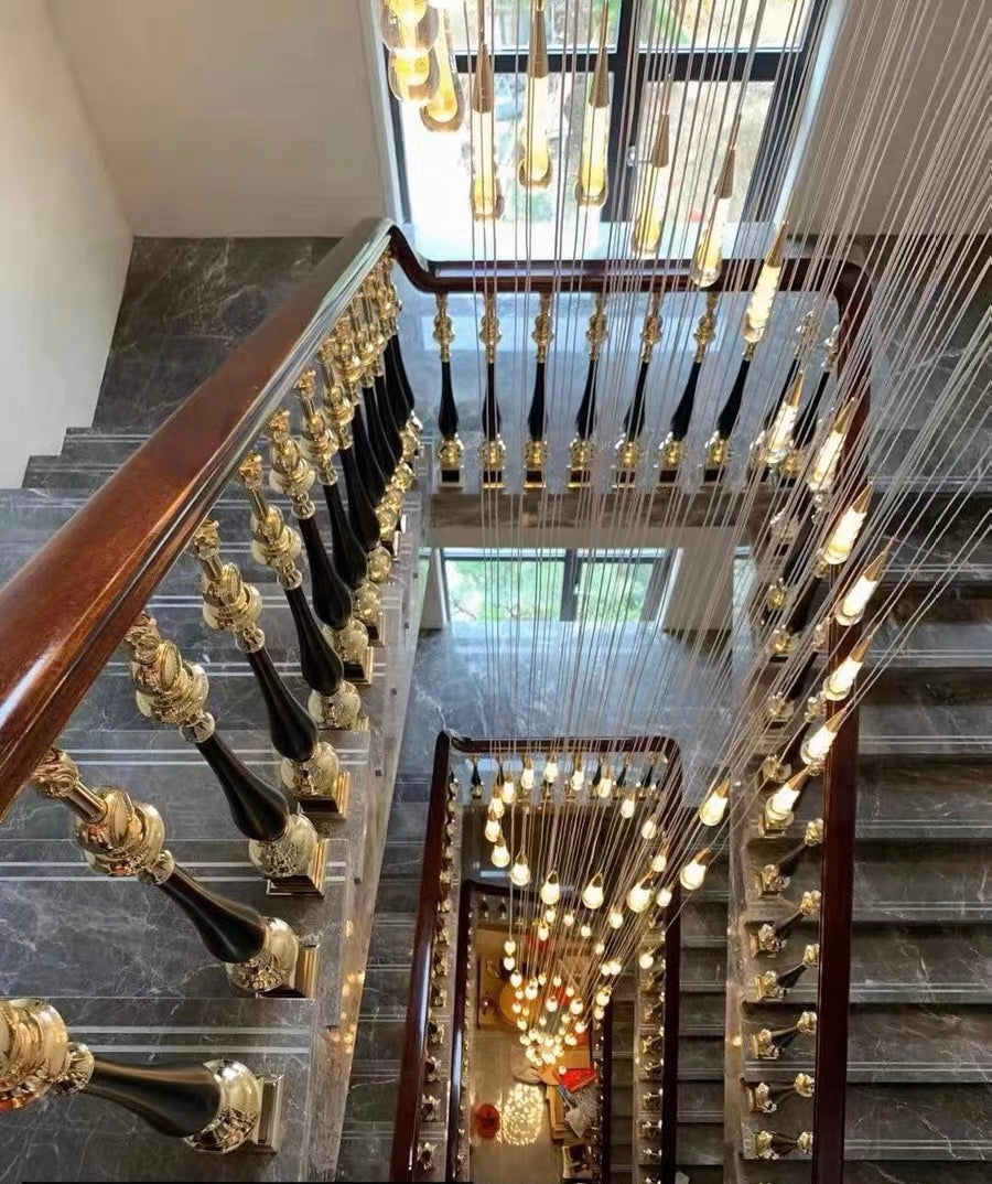 The Spiral Raindrop Staircase Ceiling Light is a unique flair to any high-ceilinged space or staircase area with its gold color scheme and raindrop style crystal lampshades. Resembling a gentle cascade of raindrops, this lighting piece is designed to mesmerize and add a distinct visual element to your decor.