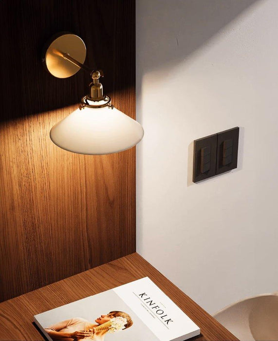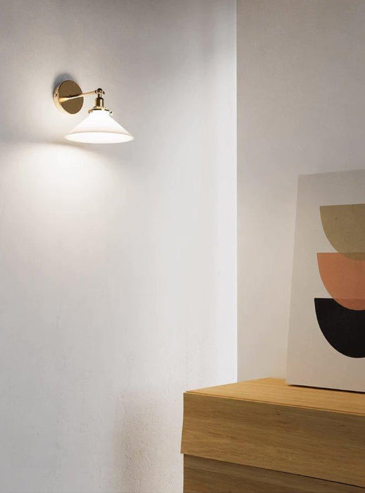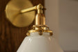 This Alabaster white brass wall light sconce embodies the French country style with a white glass shade and brass fitting, reminiscent of the art deco era. Its milky white glass shade creates a warm, gentle illumination, making it a timeless, classic addition to any space. It's swivelling arm makes this light compatible to be installed on slope ceiling or vaulted ceiling. It can also be installed as wall light or as ceiling light Offering a balance of style and function, this sconce is perfect for elevating the atmosphere of your home and adding a touch of classic style that will last for years to come. It will provide a warm and inviting atmosphere that will give your space a comfortable, cozy feel.