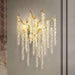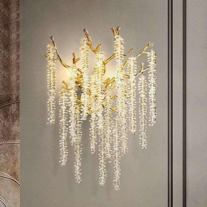 This Wall Sconces resembles a blossom tree, adding an element of nature to a room. The base is covered in gold foil and the small blossom detail pieces are made from pure frosted crystal. The cascading crystal tassels delicately reflect and refract light, creating a mesmerizing play of illumination. With its unique design and luxurious appeal, the Albero Crystal Tassel Sconce is sure to enhance the ambiance of any room, making it a perfect choice for those seeking to add a touch of opulence to their decor.