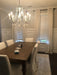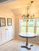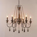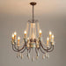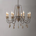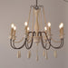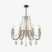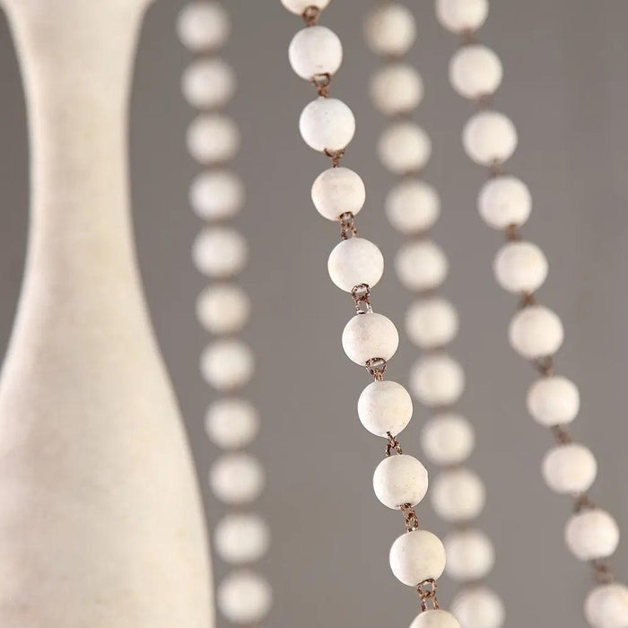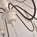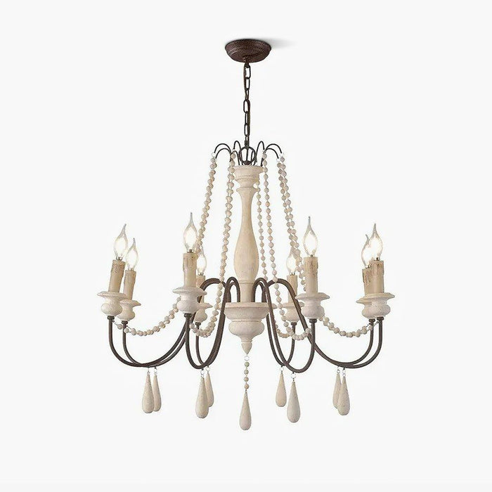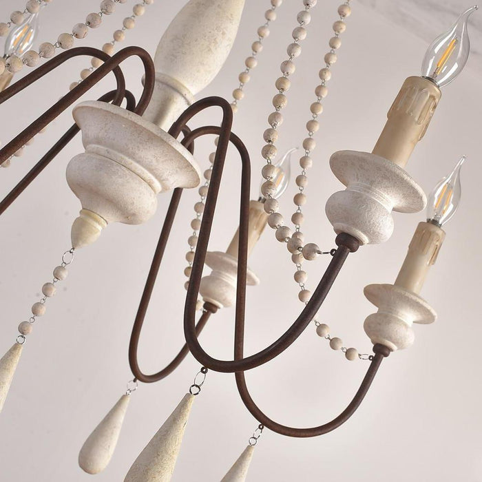 Dress up your home with this graceful wooden bead swag chandelier. Wooden bead strands swag and drape elegantly scrolling arms to give a timeless, elegant boost. Dangling teardrop ornaments echo the theme and draw the look together. Heavy metal in rust and distressed wood make a comfortable contrast. A coat of distressed white finish complements any home decor with a soft, feminine touch.