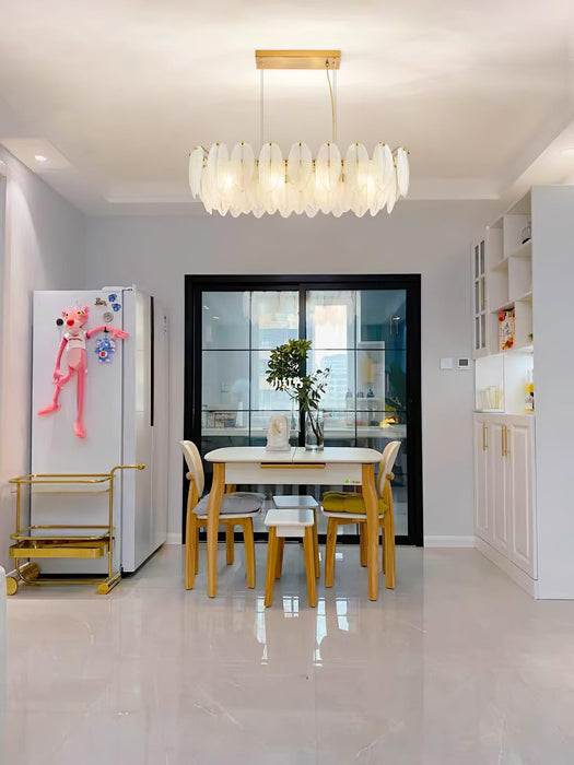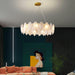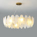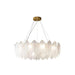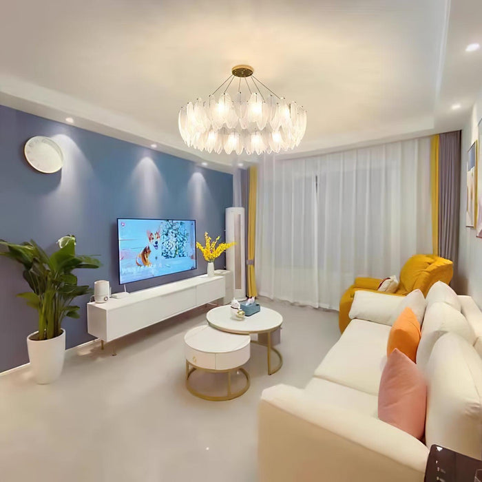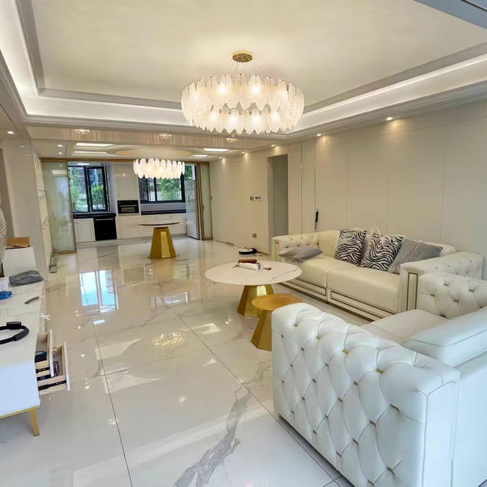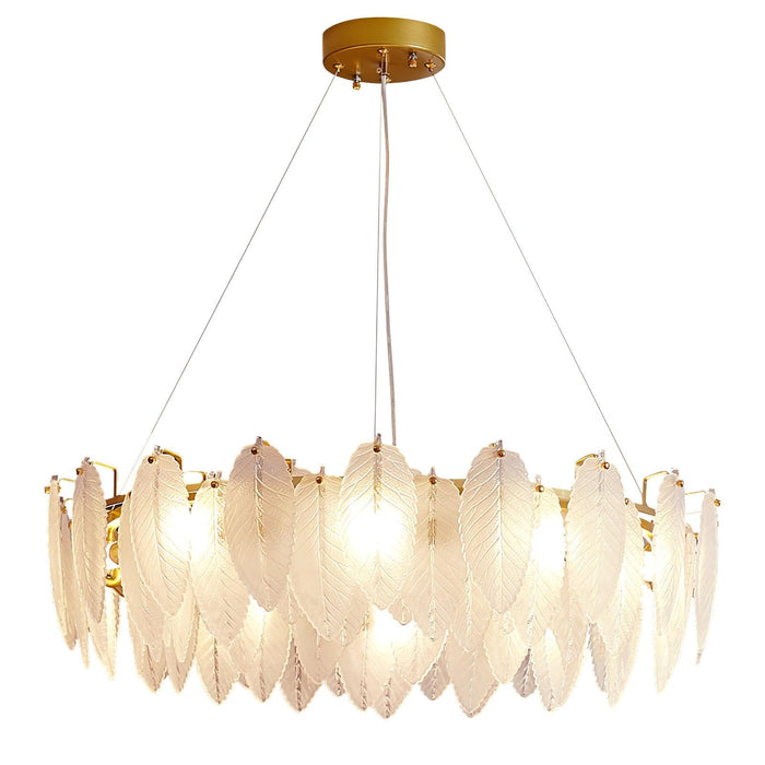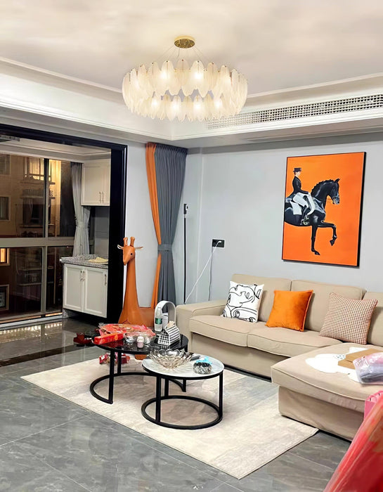 This charming round multi-tier frosted glass feather pendant light managed to combine practicality with elegance. And the design of this product makes itself overall more postmodern. When lit, lighting diffuses from the round cascading frosted glass feather shade to cast a romantic ambiance. Adjustable cable made this item perfectly fit your house. This pendant light resembles a floating feather cloud, impart great conciseness and elegance to your house.