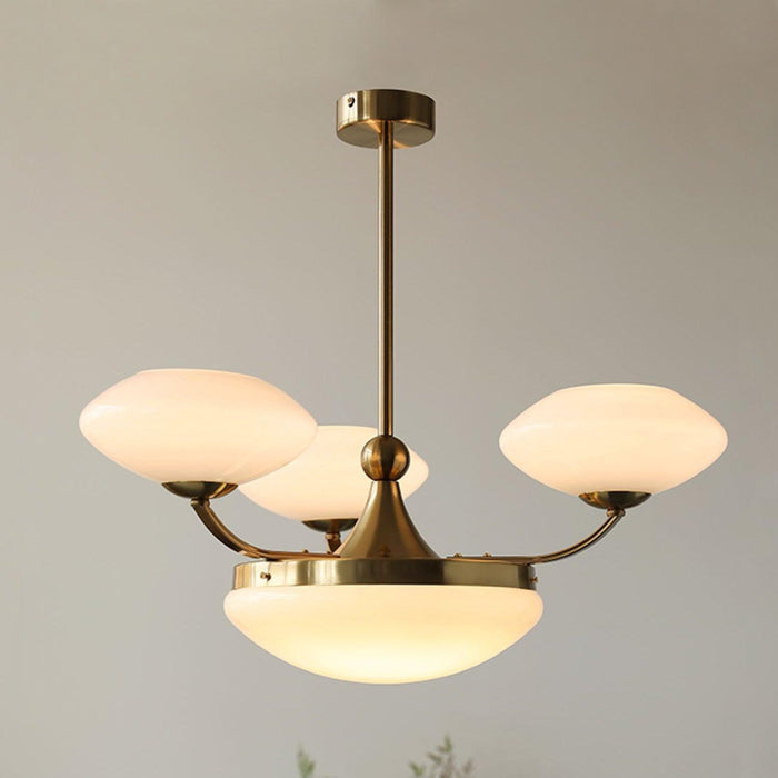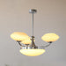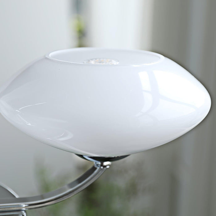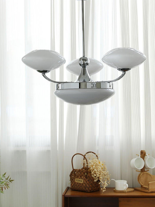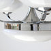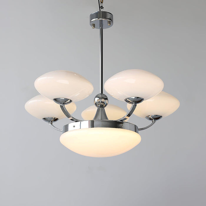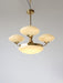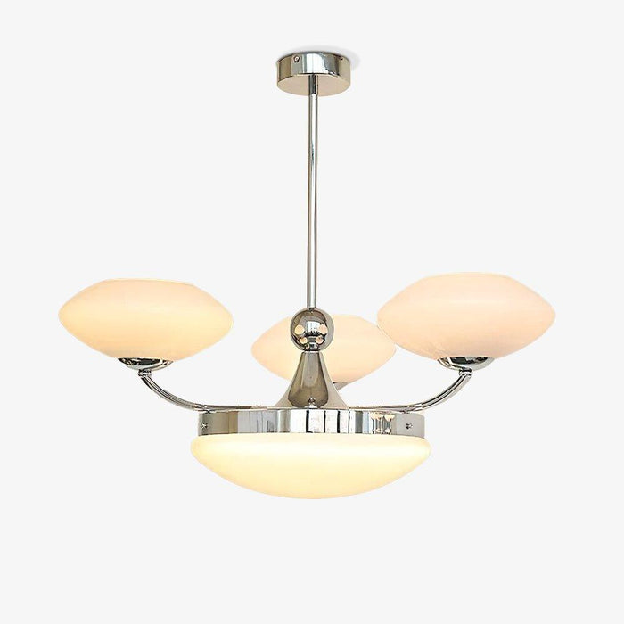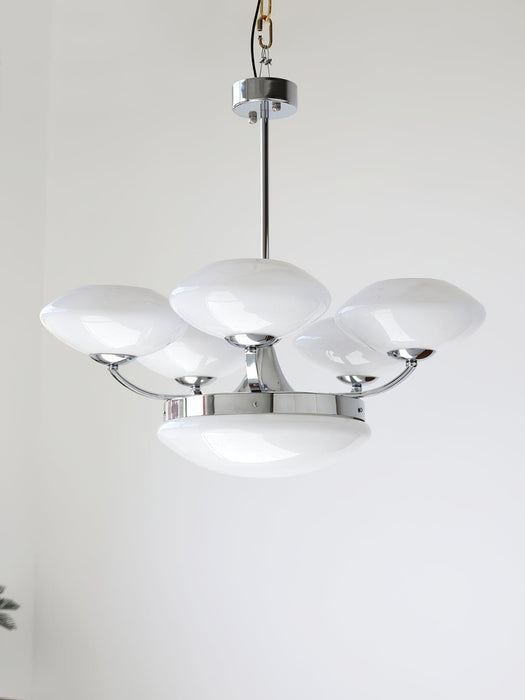 This beautiful Keston Chandelier was made in Bohemia in the 1930s. It is characterized by a chrome-plated structure with four chrome-plated circles that are interconnected by a iron element. On these circles are seated 4 glass shades.