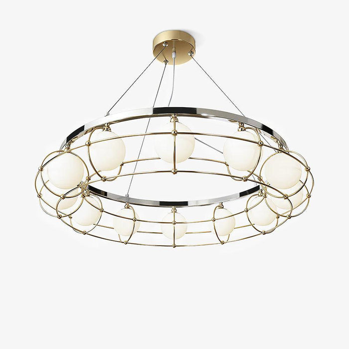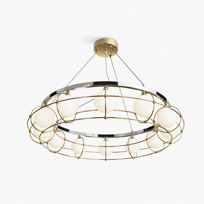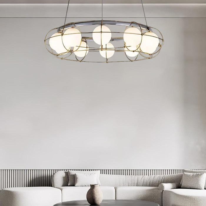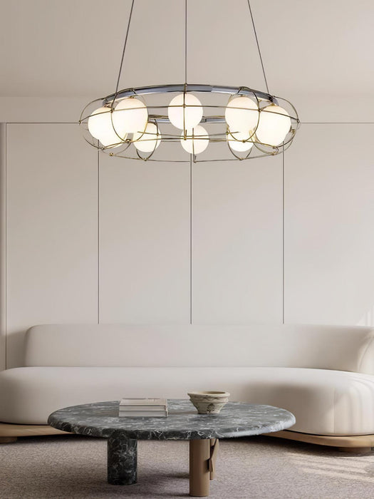 The Maytoni Round Chandelier is a striking design piece for your home. It's crafted with an industrial-inspired white glass lampshade, embedded with a large circular border to capture the light. Spruce up your living space with this modern and timeless fixture.