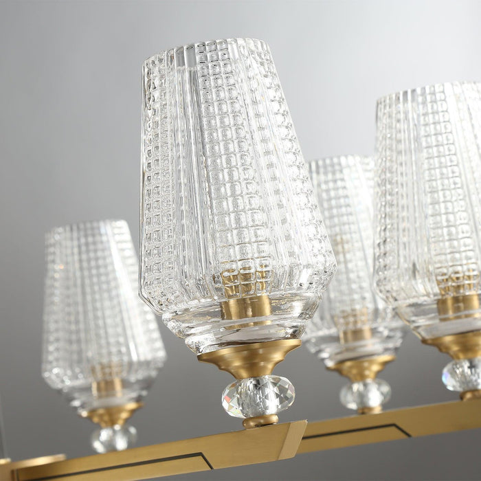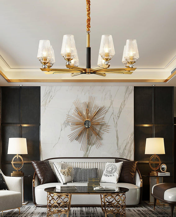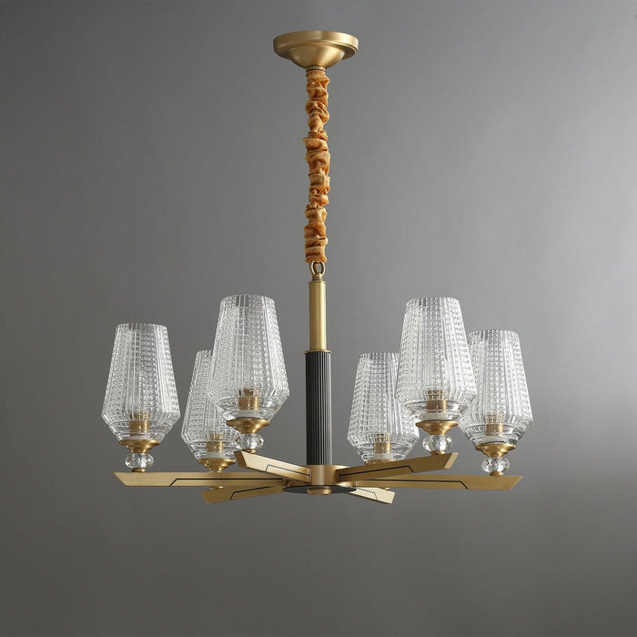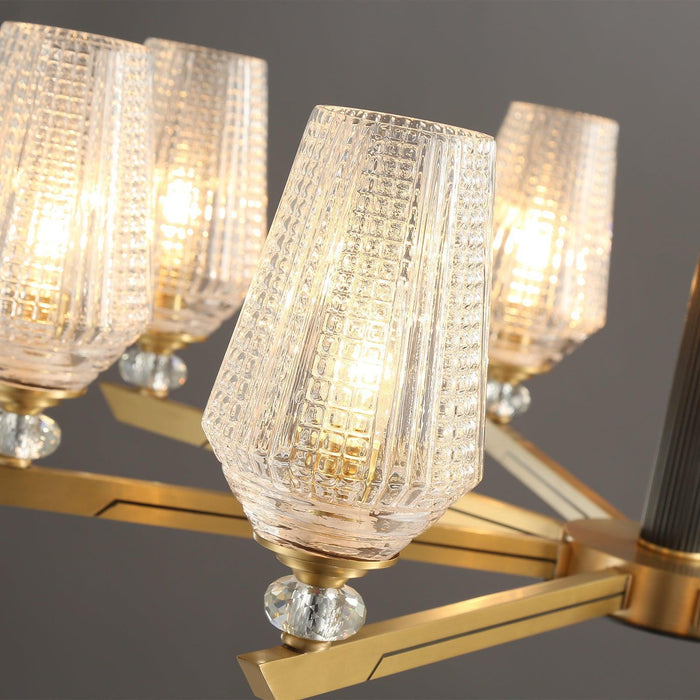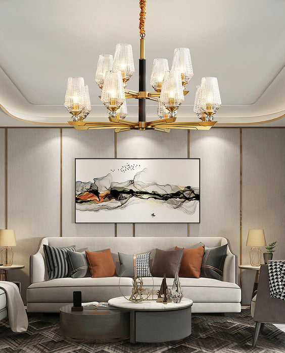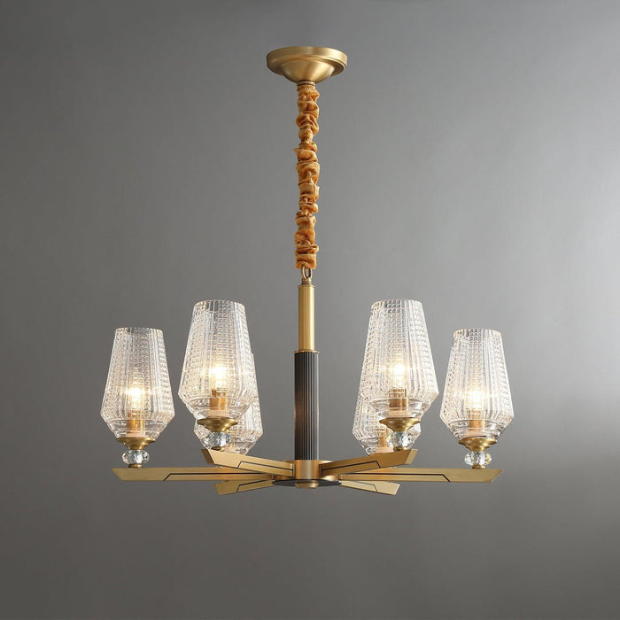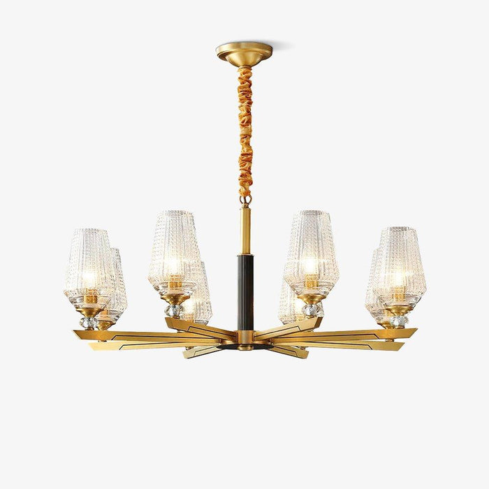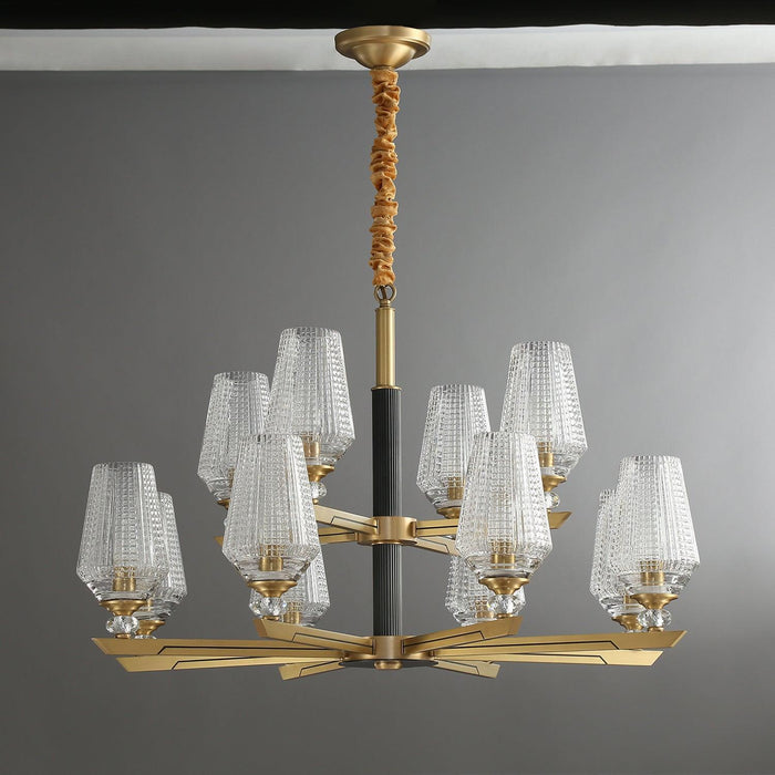 Concentric rings of faceted glass refract light inward and outward. Inspired by 20th century Austrian chandeliers, it pairs ribbed glass with a solid brass frame.The clear glass leaves have a relief on the outside and are shiny on the inside. The chandelier emits a stunning light.