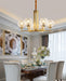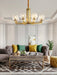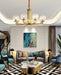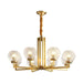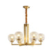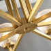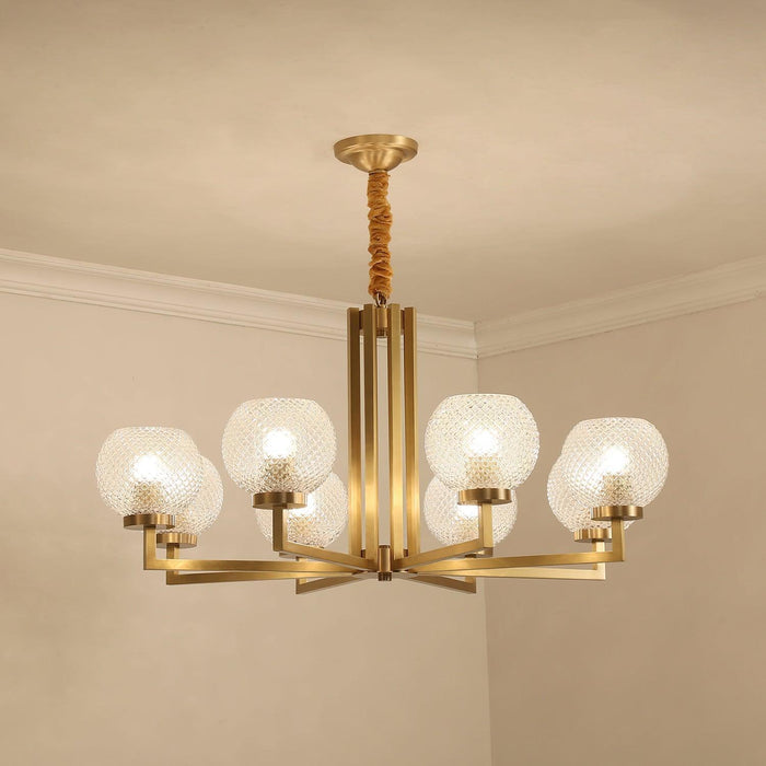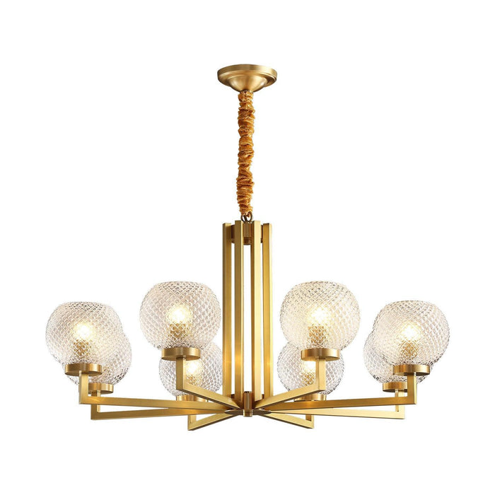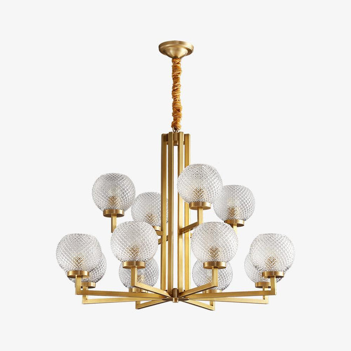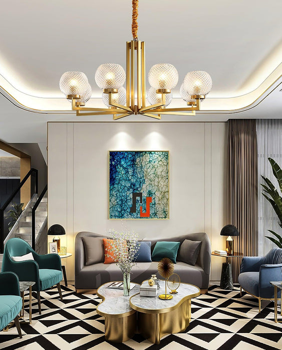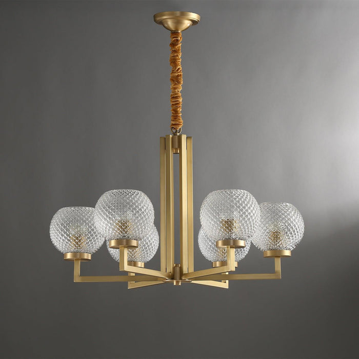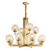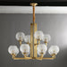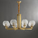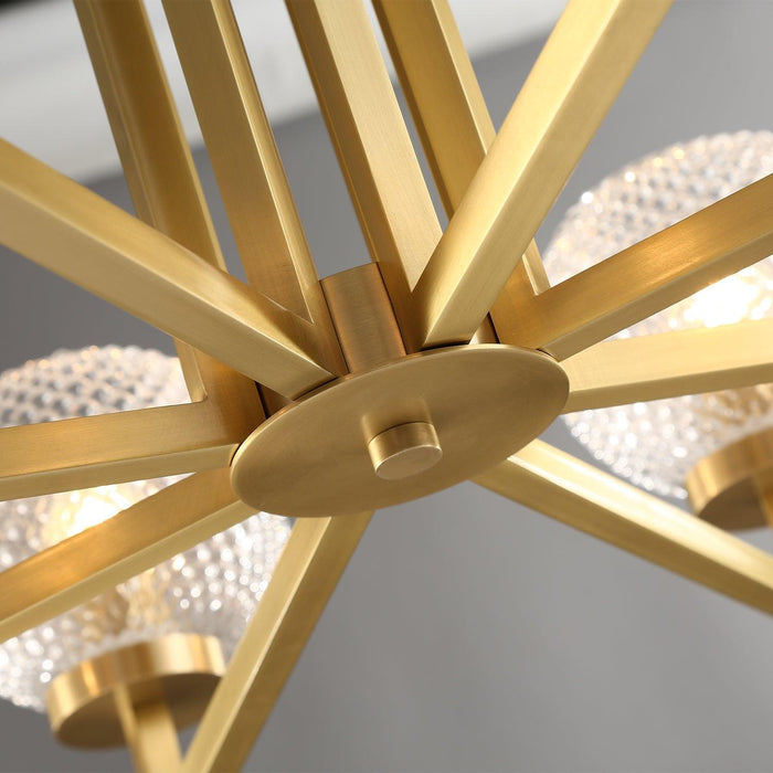 "Luxurious and stunning, the modern Helios chandelier is characterized by its perfectly angled, With bulbs neatly housed in aged brass, ribbed glass orb shades for an added touch of whimsy. The overall composition is futuristic and leans mid-century modern in its styling. This striking luminary comes together harmoniously in its eye-catching geometry and luxury appeal.
