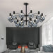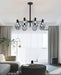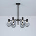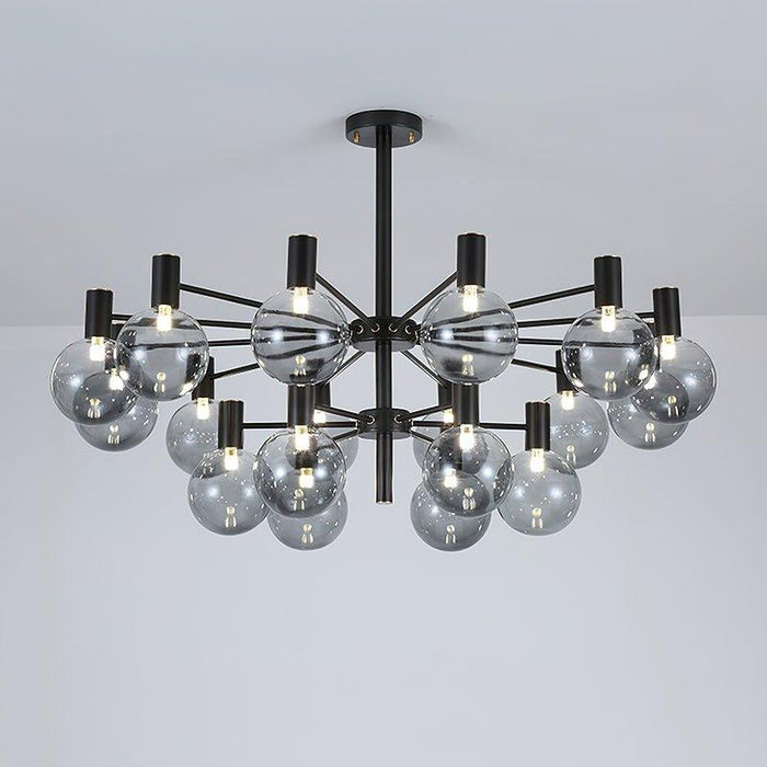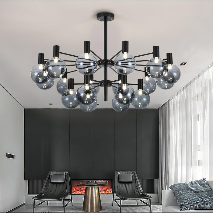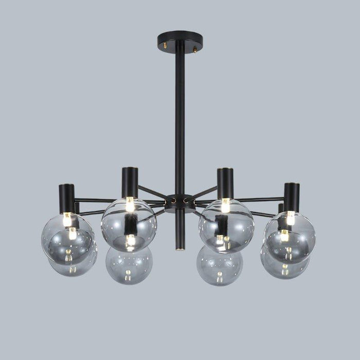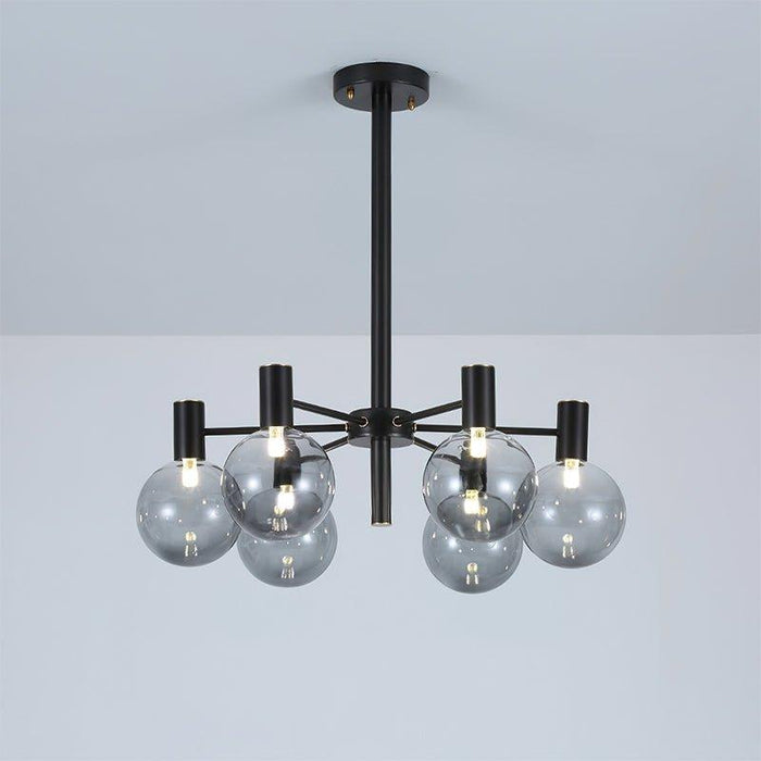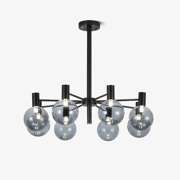 The Selva Black Chandelier is a modern take on mid-century design, featuring a sleek black frame supporting a smoky gray glass globe. This piece elegantly combines simplicity with drama, making it the perfect addition to any contemporary space looking for a blend of sophistication and minimalist style. The arrangement of the spherical lights ensures balanced lighting, perfect for creating a cozy atmosphere in the dining area or living room.