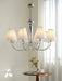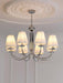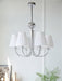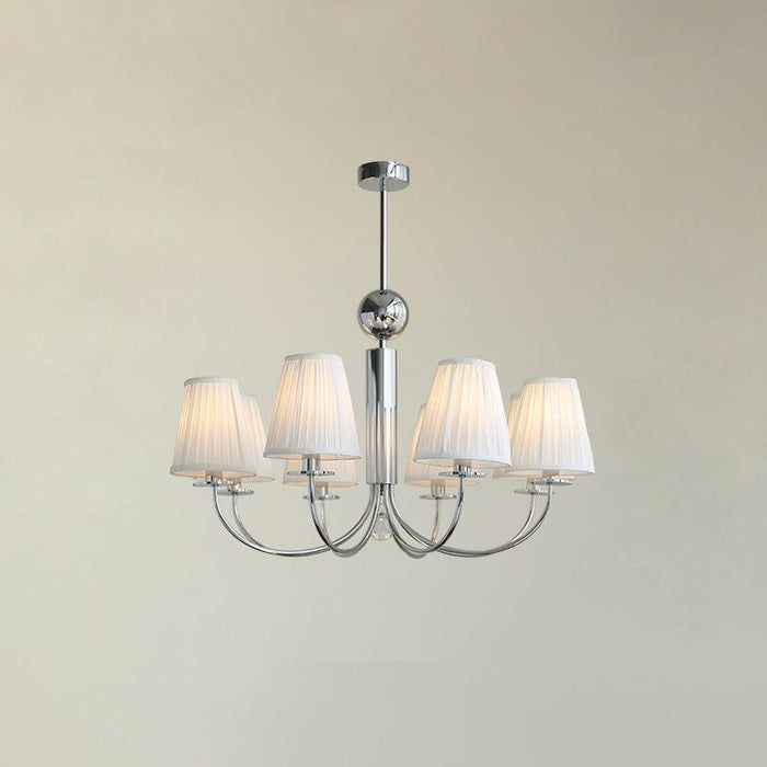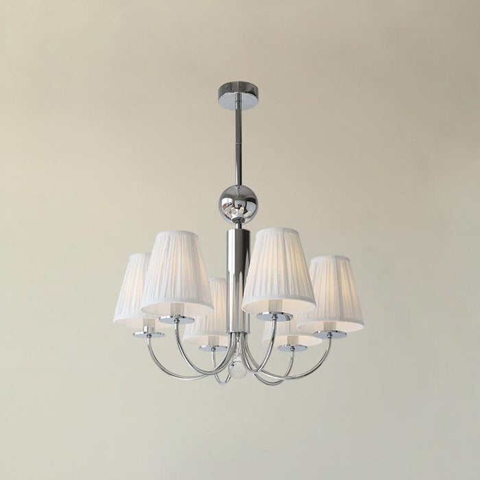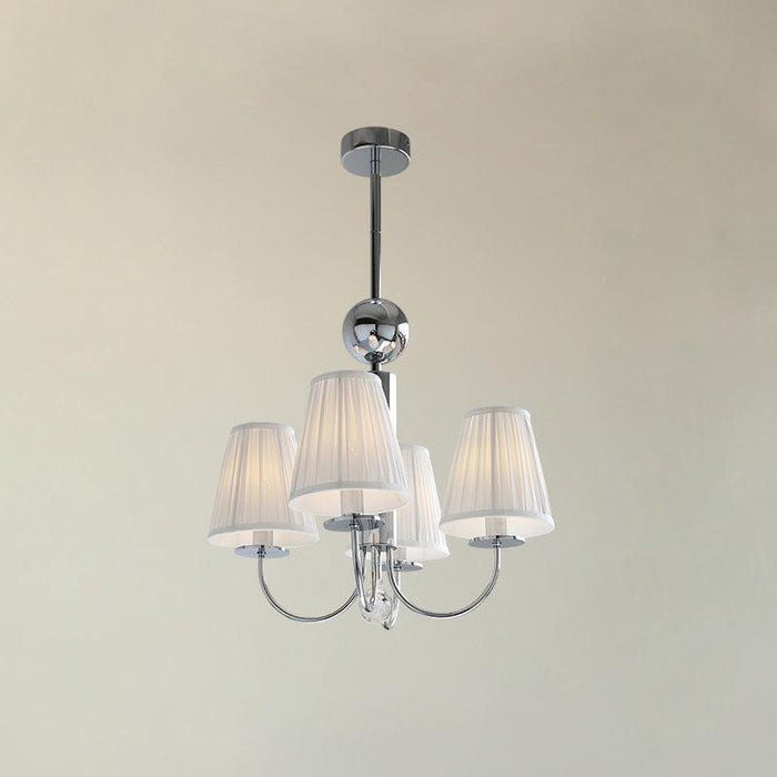 This ceiling fitting is a beautifully crafted, candelabra style chandelier. Elaborate curved hoops finished in chrome spill out from the decorative central column, which incorporates a pretty faceted glass ball. With a finish in chrome, this delightful ceiling light comes complete with white pleated cotton shades.