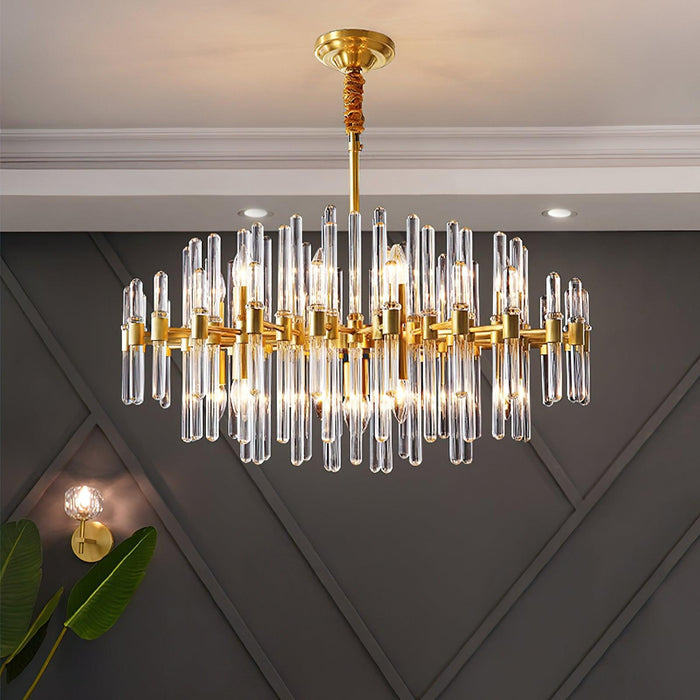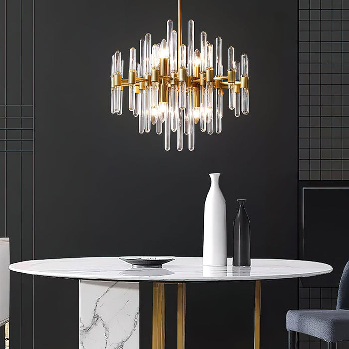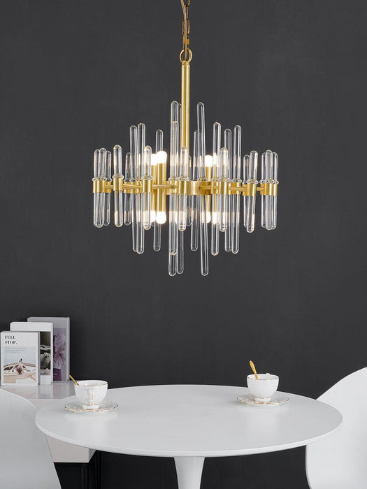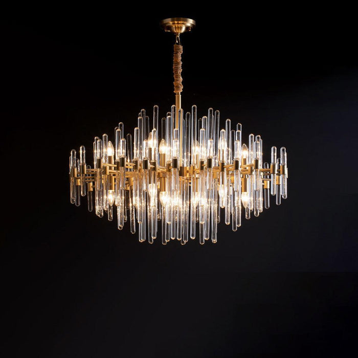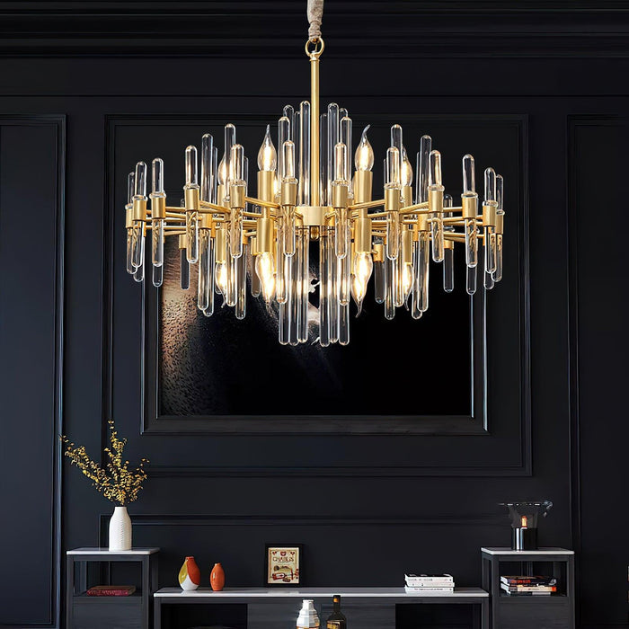 The Antique Brass Chandelier boasts a starburst design that's contemporary and stylish. Made of brass with a vintage-inspired brushed brass finish, and getting its cue from mid-century modern designs, this incredible chandelier is highlighted with clear glass rods that give it a sparkling, spacy effect. perfectly marries the modern elegance of the past with the flair of anew. Finished in a beautifully refined Burnished Antique Brass finish accented by clear glass rods, destined to withstand the ages. Made with solid brass construction to look great.
